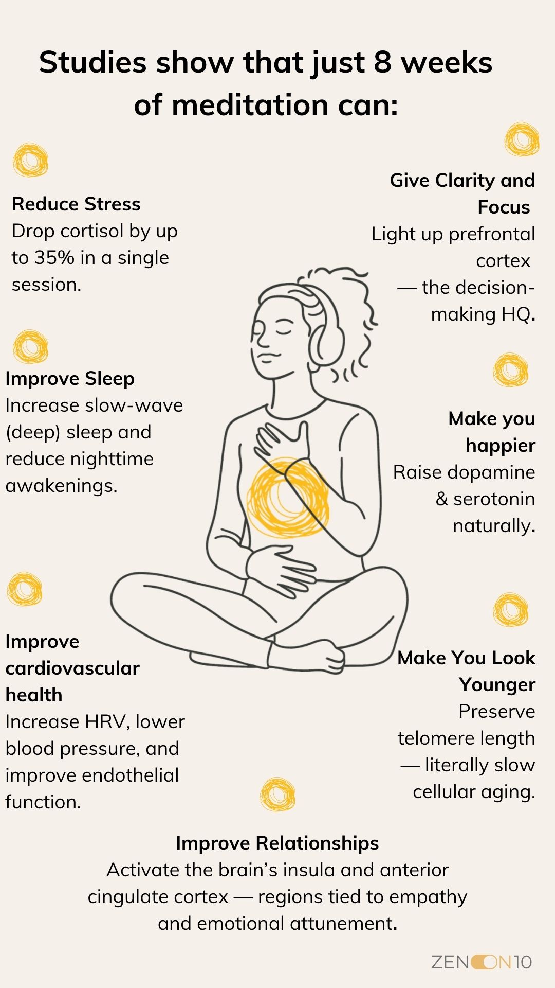 Zen on 10 combines techniques that are backed by modern neuroscience and validated through measurable results. Rooted in thousands of years of meditation traditions, it’s practical, proven, and free of woo-woo.